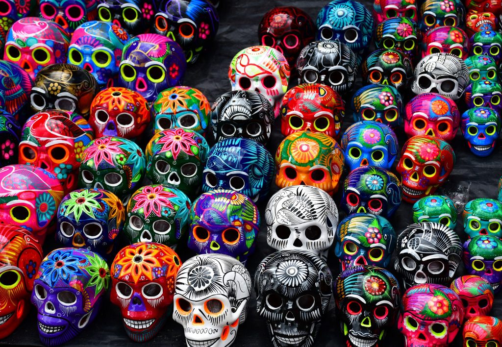Le calaveras sono il simbolo più potente del Día de los Muertos. Teschi colorati, spesso di zucchero o di ceramica, decorati con fiori, linee dorate e arabeschi. Non rappresentano la morte come orrore, ma come continuità. Ogni teschio è un ritratto allegro di chi non c’è più e in Messico il morto non è mai morto del tutto finché qualcuno lo ricorda.