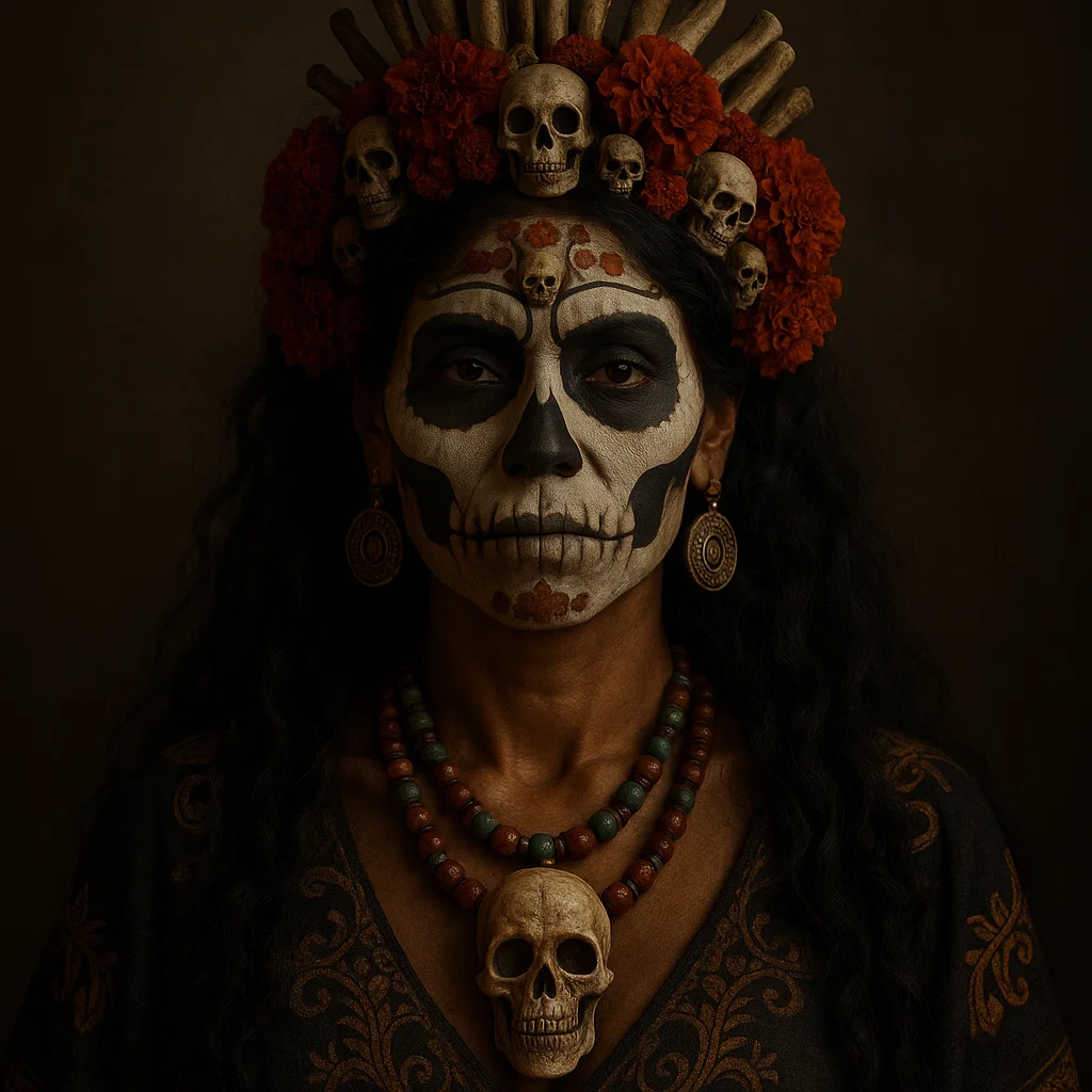 Prima che arrivassero gli spagnoli con le loro croci e la loro ossessione per il peccato, gli antichi popoli del Messico( Aztechi, Maya, Zapotechi, Purépecha) avevano già un rapporto confidenziale con la morte. Non la temevano, la onoravano. La consideravano una compagna di viaggio, una parte naturale del ciclo cosmico. La Dea Mictecacihuatl, la “Signora della Morte”, governava il Mictlan, l’aldilà azteco, e riceveva offerte di fiori, cibo e teschi in segno di rispetto.