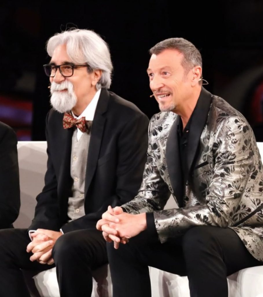 Amadeus e Peppe Vessicchio mentre ascoltano gli artisti