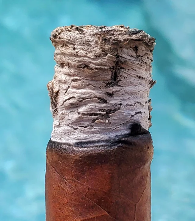 Arrivati al secondo terzo, il profilo si stabilizza e si allarga. Il tabacco honduregno emerge con chiarezza: cuoio, caffè amaro, una componente minerale che resta sul palato e lo rende ruvido. Non è una progressione morbida ma una stratificazione solida. La forza è medio-forte, ma ben distribuita. Non c’è un’ esplosione improvvisa ma piuttosto una crescita costante che accompagna la fumata.