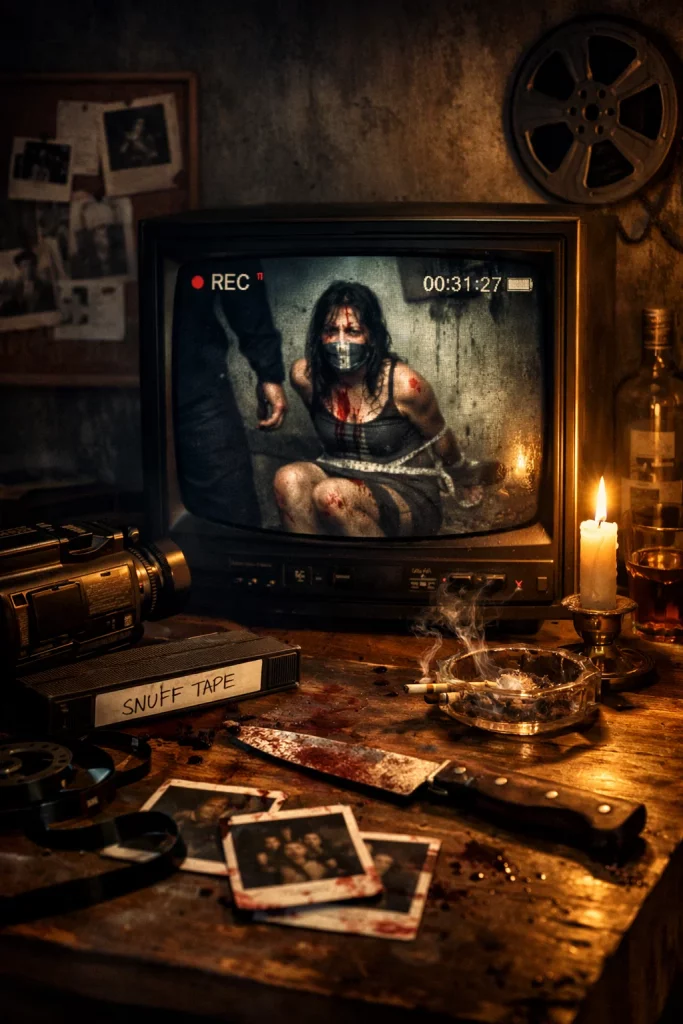 Se vuoi capire dove si muovevano queste cose, devi dimenticare i cinema eleganti. Devi scendere nei grindhouse, nei cinema di terza categoria, nelle sale dove l’aria era densa di fumo e disperazione. Negli anni Settanta e Ottanta, il circuito exploitation vive di eccessi. Violenza, sesso, tabù. Più si spinge oltre, più vende. Gli snuff diventano la frontiera ultima, il limite che non dovrebbe essere superato e quindi il più appetibile. Le videocassette fanno il resto. Il VHS democratizza l’orrore. Non serve più una sala, basta un televisore e una porta chiusa. Nascono leggende su nastri clandestini, passaggi di mano in mano, collezionisti deviati. La verità si mescola alla finzione come whisky scadente.
